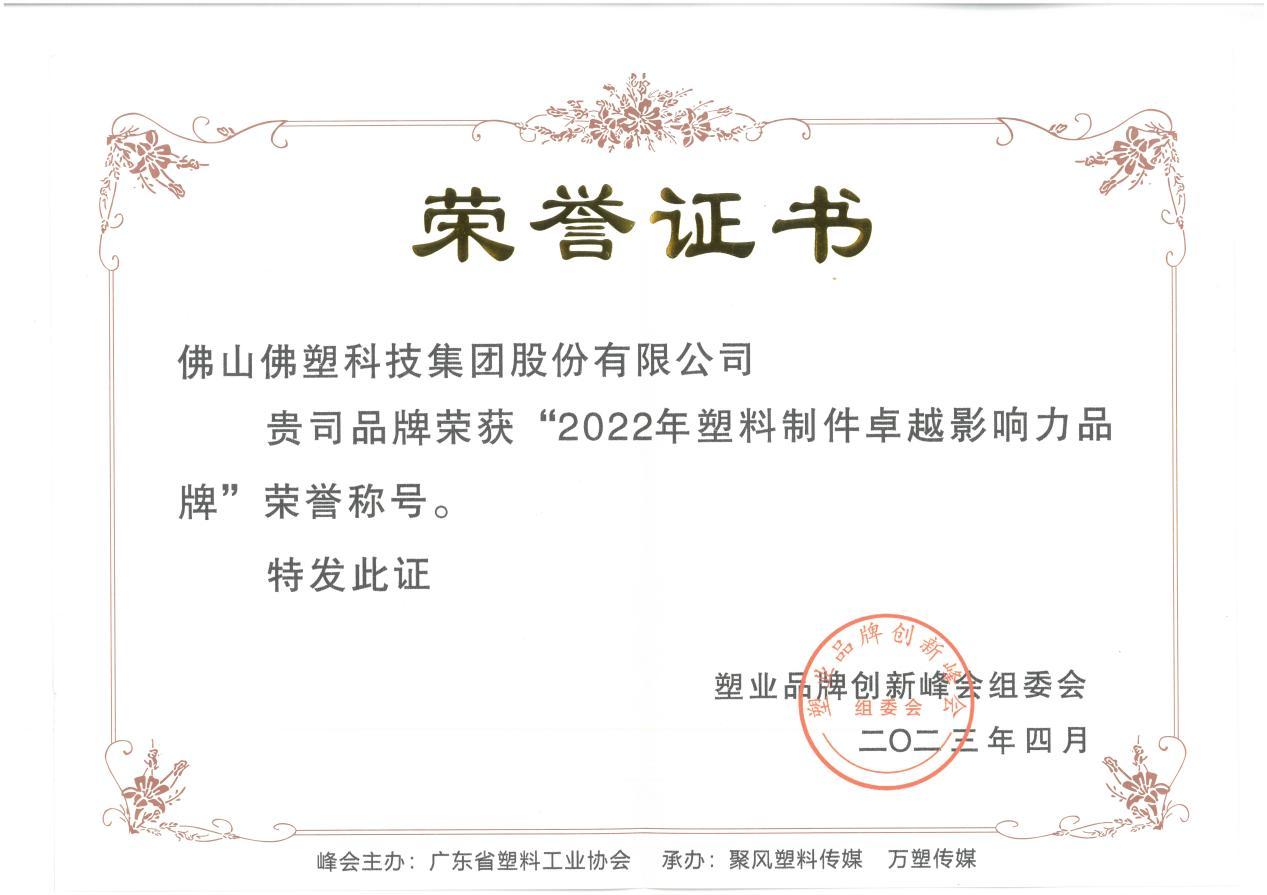 4月15日,2023年塑业品牌创新峰会暨2022年度塑业品牌颁奖盛典在深圳举行。佛塑科技荣获“2022年塑料制件卓越影响力品牌”荣誉称号。