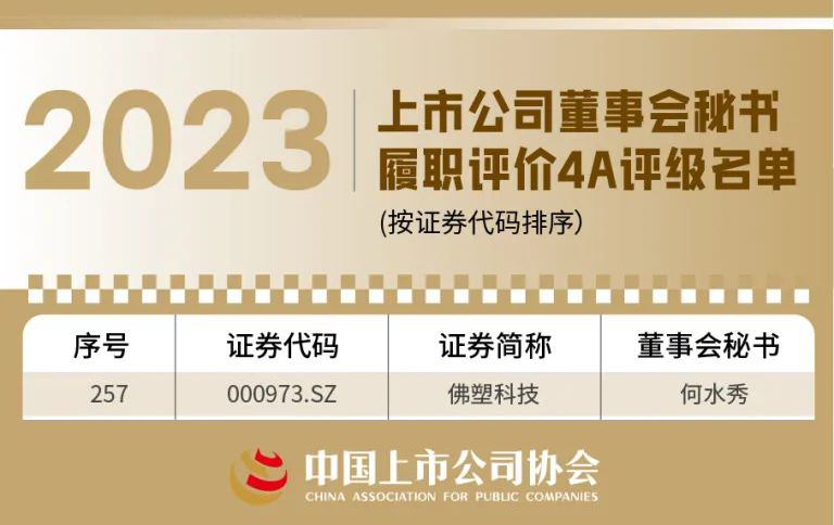 中国上市公司协会于近日揭晓“上市公司董事会秘书履职评价”结果,佛塑科技董事会秘书再次荣获4A评级。