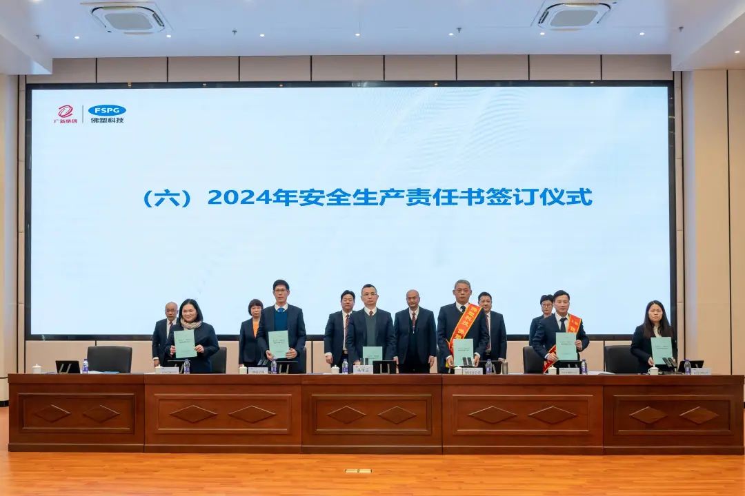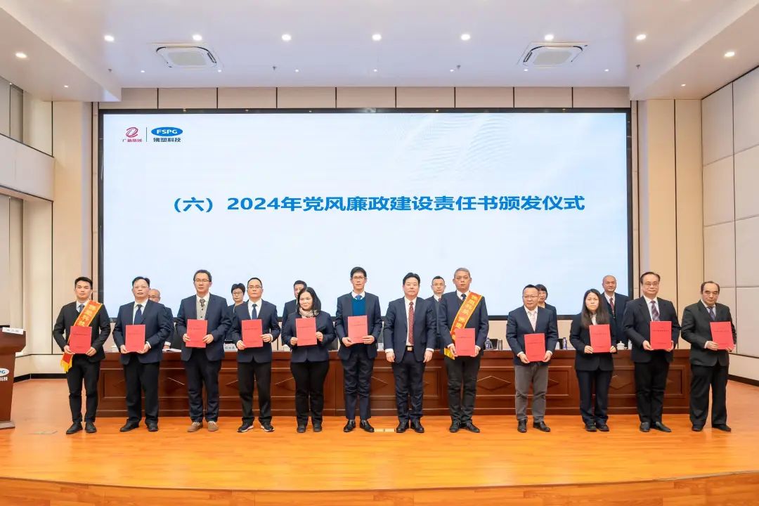 叶志超宣读《关于佛塑科技2023年度“创先争优”劳动竞赛的表彰决定》,公司领导班子为获奖单位及个人颁奖。卓越团队、佛塑之星及十杰员工先进代表分享优秀经验。会议现场签订了2024年度公司安全生产责任书,颁发2024年党风廉政建设责任书,定目标明责任,做好安全生产及党风廉政建设工作,为高质量发展保驾护航。