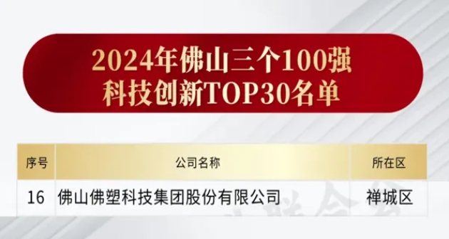 9月27日,佛山市企业联合会、佛山市企业家协会、佛山市总商会重磅发布佛山骨干企业调研成果,2024年佛山企业利税TOP30、科技创新TOP30、国际化TOP30三个名单正式发布。佛塑科技荣登2024年佛山科技创新TOP30第16位。