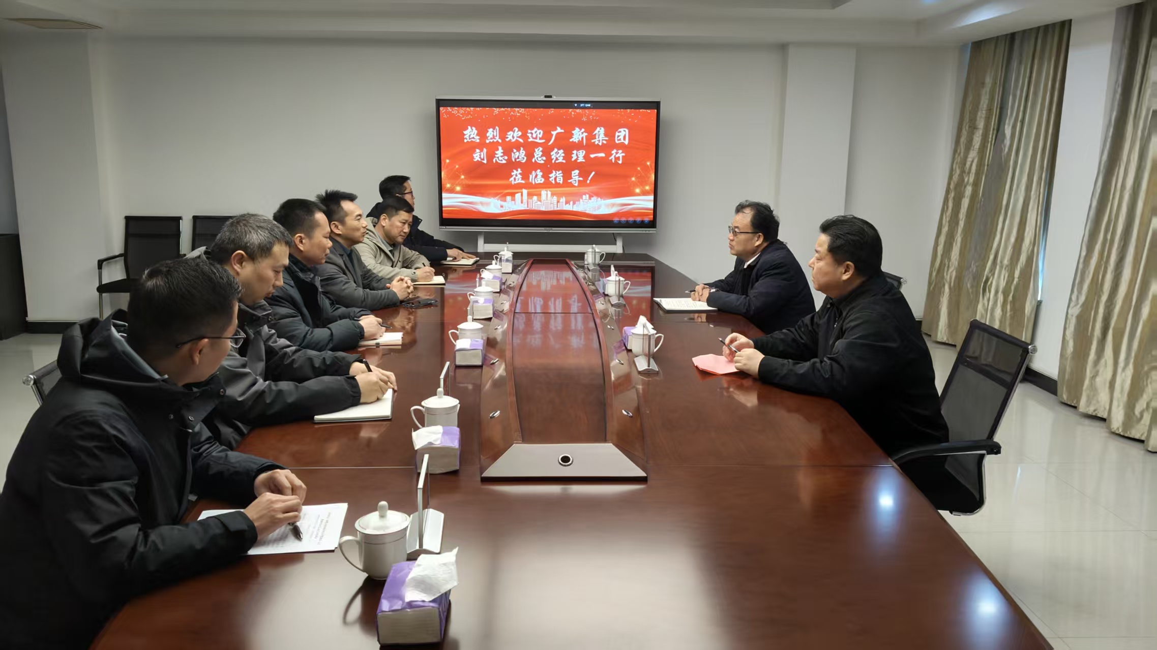 2026年2月1日,广新集团党委副书记、总经理刘志鸿一行到广聚新材指导工作。广新集团党委委员、副总经理,佛塑科技党委书记、董事长唐强,佛塑科技副总裁、广聚新材董事长陈广艺参加座谈。