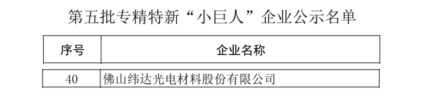 近日,佛塑科技控股子公司佛山纬达光电材料股份有限公司(以下简称“纬达光电”)成功入选第五批国家专精特新“小巨人”企业,标志着纬达光电在科技创新能力、核心技术优势、发展潜力等方面获得国家级认可,同时也标志着纬达光电继北交所上市后,发展再迎来新的里程碑。