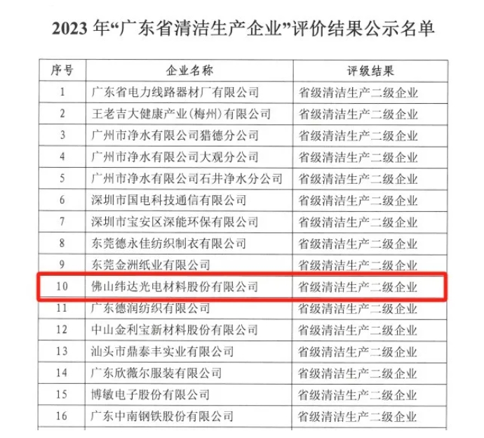 7月8日,广东省清洁生产协会发布2023年“广东省清洁生产企业”评价结果的公示,佛塑科技控股子公司佛山纬达光电材料股份有限公司(下称“纬达光电”)获评“省级清洁生产二级企业”,成为《广东省清洁生产企业评价准则》(T/GDCPA011-2023)新规执行后首批通过该评价的16家企业之一。本次通过省级评级是对纬达光电在节能减排、资源利用和环境保护等方面所取得成效的充分肯定。