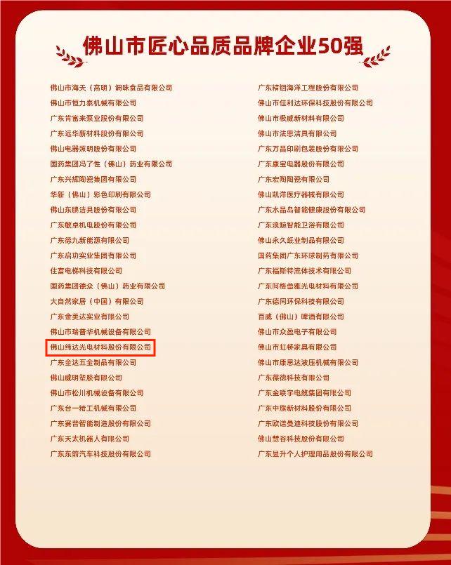 “佛山市匠心品质品牌企业50强”榜单重点评估企业对工匠精神的践行力度,以及追求卓越品质、将产品质量做到极致的典范做法,从市场占有率、品牌形象、质量水平、科技创新等多个维度对企业进行综合评价。